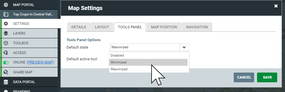 Select your preferred active tool. This determines which tool will be active when your map loads. All active tools will be shown in the list of available options, including the legend.